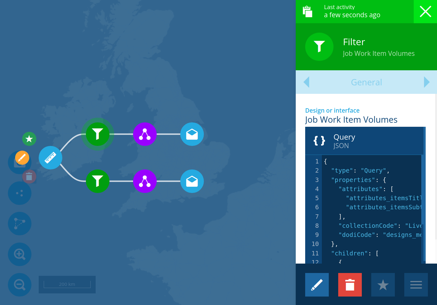Currently in the workflow editor when you click on a node that uses a Query, you see Query JSON in the right panel with no other indication of what the Query is doing. This makes it very difficult to see what a workflow is doing from the main overview. It would be better to display a preview of the AQS builder view on the main screen or somewhere else accessible when clicking on a node using it.